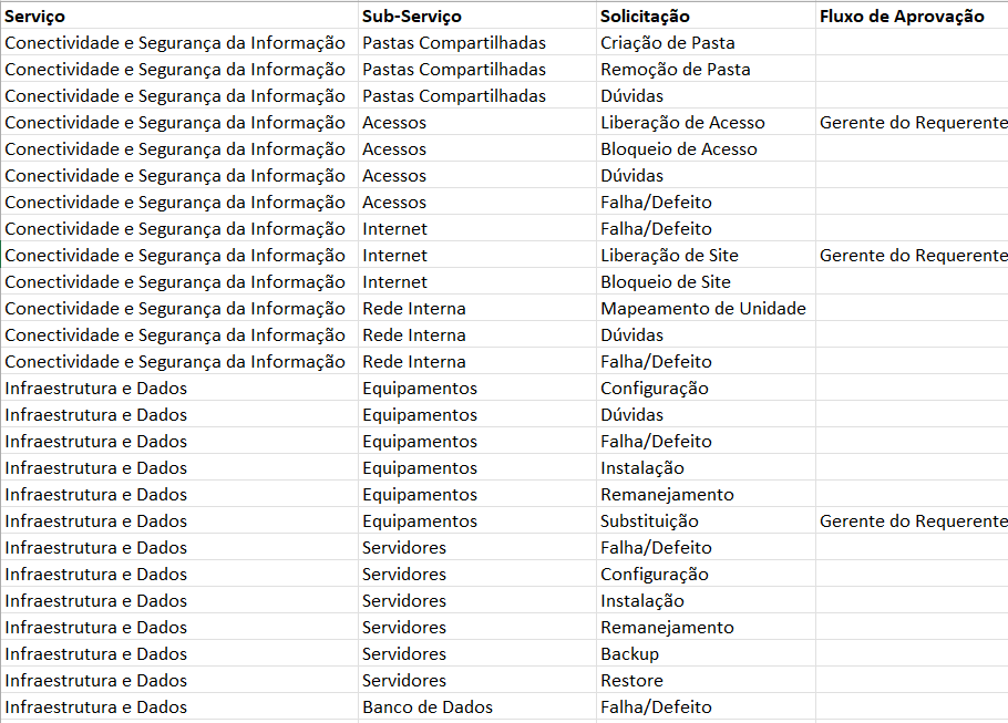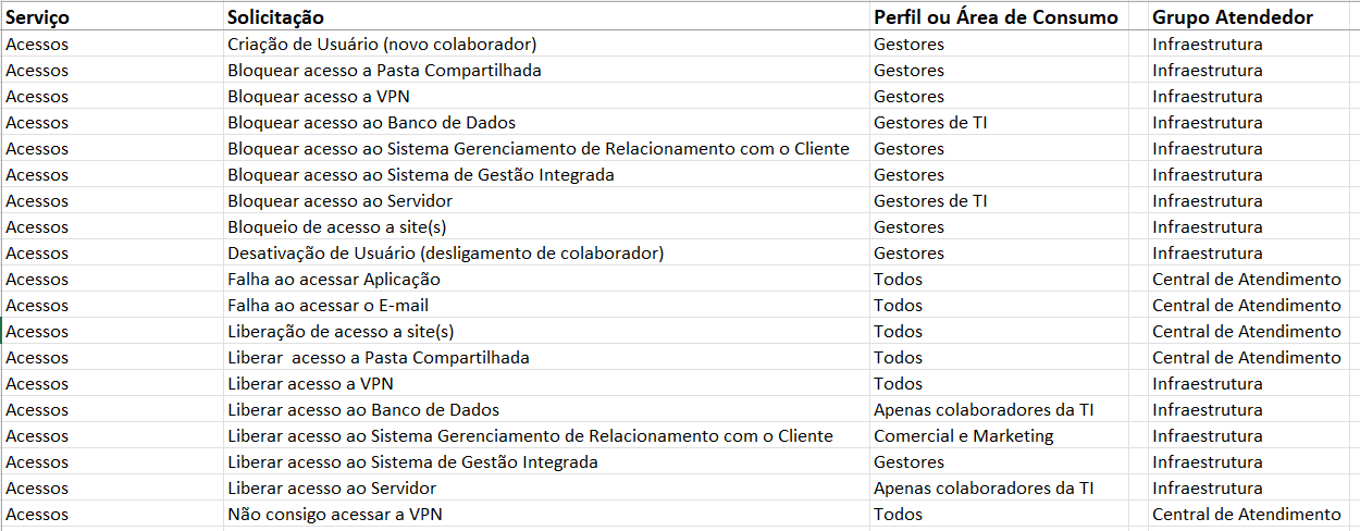 Acessos - Utilizando esse serviço como base, vamos entrevistar nossos usurários e questionar quais são as solicitações que eles costumam fazer para esse serviço, provavelmente iremos receber respostas como: liberação de acesso a rede, a uma pasta compartilhada, a um sistema específico.