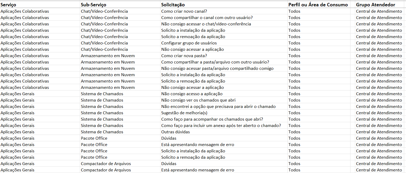 De uma forma simplificada, vamos construir um catálogo de serviços de Tecnologia da Informação com base em quatro serviços: acessos, rede e conectividade, sistemas e equipamentos.