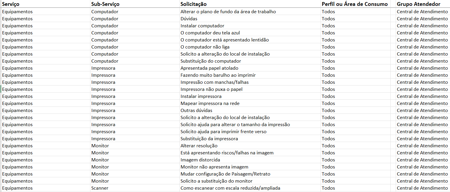 Equipamentos - Seguiremos com a mesma ideia dos sistemas, utilizando os tipos de equipamentos como sub-serviços, isso facilitará não só o preenchimento da solicitação pelo cliente, como ajudará na montagem do formulário para abertura de chamados.